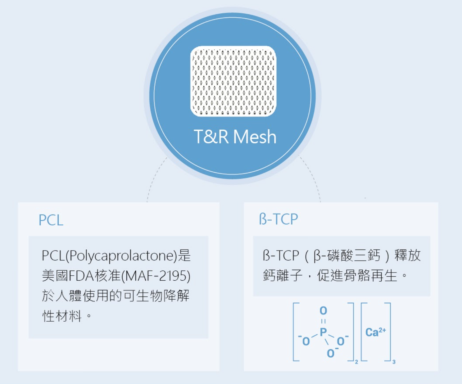 本產品為多孔的100%PCL(聚己內酯),通過水解在體內完全分解再吸收,隨後被身體代謝。具有相互連接的多孔結構,有各種尺寸和厚度可以修剪符合解剖條件,產品使用FDM(熔融沉積成型)3D積層製造而成。